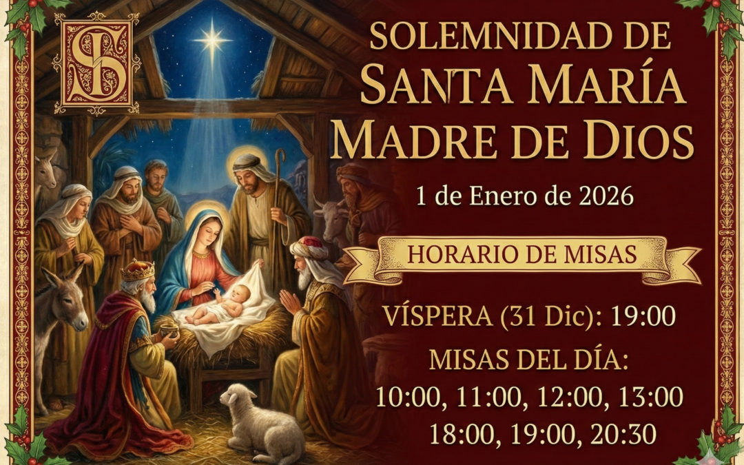 Misas de Año Nuevo Solemnidad de Santa María Madre de Dios Dic 28, 2025 | Actualidad MISAS VISPERA: 19:00 h. Misas del día: 10, 11, 12, 13; 18, 19, 20:30